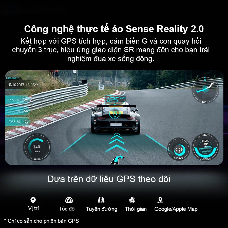 Công nghệ này cho phép hiển thị tốc độ của các xe khác trên đường, bên cạnh đó có thể chỉnh sửa video ngay trên ứng dụng của camera. Kết hợp với GPS tích hợp, cảm biến G và con quay hồi chuyển 3 trục, hiệu ứng giao diện SR đã được cải tiến để mang đến cho bạn một trải nghiệm lái xe đặc biệt hơn bao giờ hết.