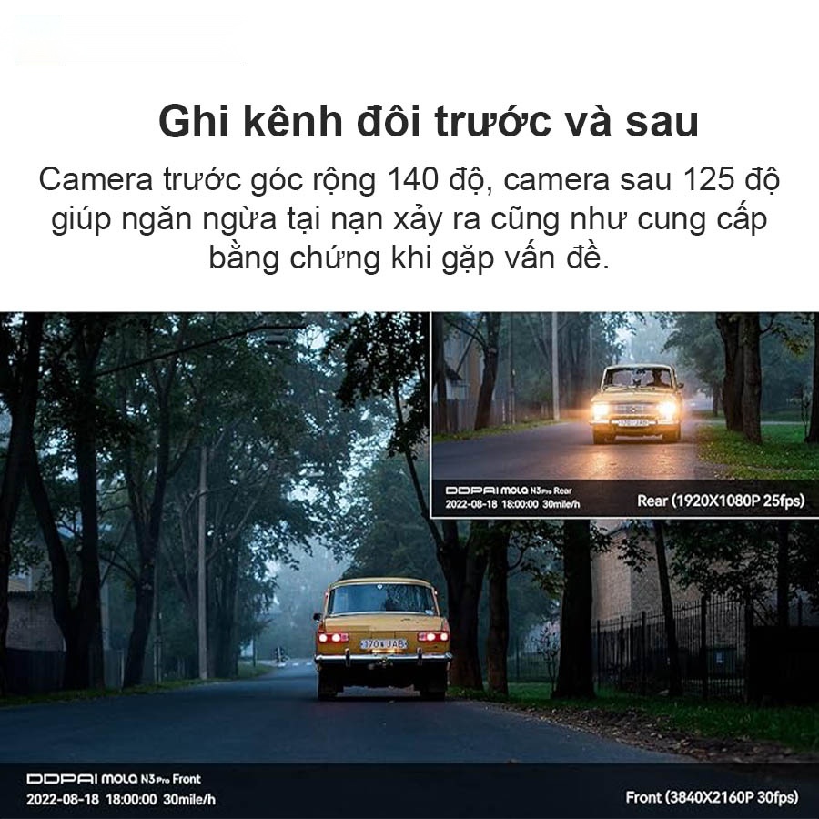 DDPAI Mola N3 Pro GPS có camera trước với góc rộng 140 độ và camera sau với góc 125 độ giúp bạn kiểm soát hoàn hảo mọi vấn đề xảy ra với phương tiện của mình. Trong trường hợp có sự cố bất ngờ, DDPAI MOLA N3 PRO GPS sẽ trở thành “nhân chứng” đáng tin cậy, cung cấp đầy đủ thông tin và bằng chứng cho bạn.