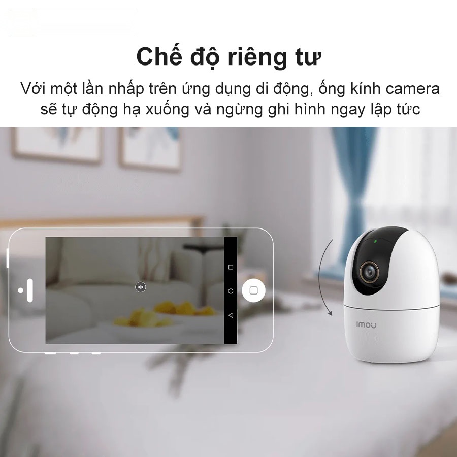 Camera Imou IPC-A32EP-L được tích hợp chế độ riêng tư, mang đến sự an tâm cho người dùng khi không muốn bị ghi lại những hình ảnh riêng tư, cá nhân. Chỉ với một lần nhấp trên ứng dụng di động, ống kính camera sẽ tự động hạ xuống và ngừng ghi hình ngay lập tức, đảm bảo không gian riêng tư tuyệt đối cho người dùng. Tính năng này đặc biệt hữu ích khi bạn ở nhà và cần bảo vệ sự riêng tư cá nhân.