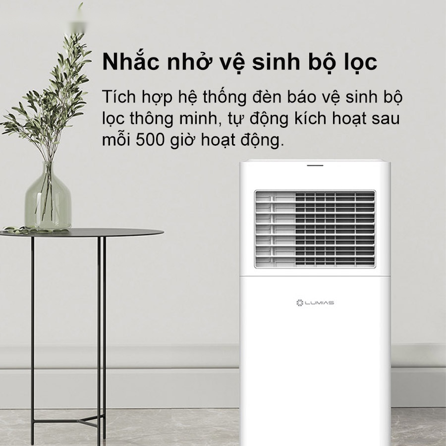 Bên cạnh đó, điều hòa di động Lumias PAC-26 còn được tích hợp hệ thống đèn báo vệ sinh bộ lọc thông minh, tự động kích hoạt sau mỗi 500 giờ hoạt động. Tính năng này giúp người dùng dễ dàng nhận biết thời điểm cần làm sạch bộ lọc, từ đó duy trì hiệu suất vận hành ổn định, tiết kiệm điện năng và kéo dài tuổi thọ máy. Đồng thời, việc vệ sinh định kỳ còn đảm bảo luồng khí luôn trong lành, sạch khuẩn, góp phần bảo vệ sức khỏe cho cả gia đình trong quá trình sử dụng.