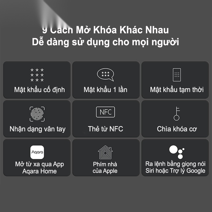 Khóa cửa thông minh Aqara A100 Zigbee cung cấp cho người dùng tới 9 phương pháp mở khóa khác nhau. Giúp người dùng đa dạng hơn trong cách mở khoá mà không cần phải lo lắng về vấn đề bảo mật. Bạn có thể dễ dàng quản lý mật khẩu, vân tay từng thành viên trong gia đình trên APP điện thoại, kĩ thuật Mivietnam sẽ hướng dẫn bạn sử dụng chi tiết.