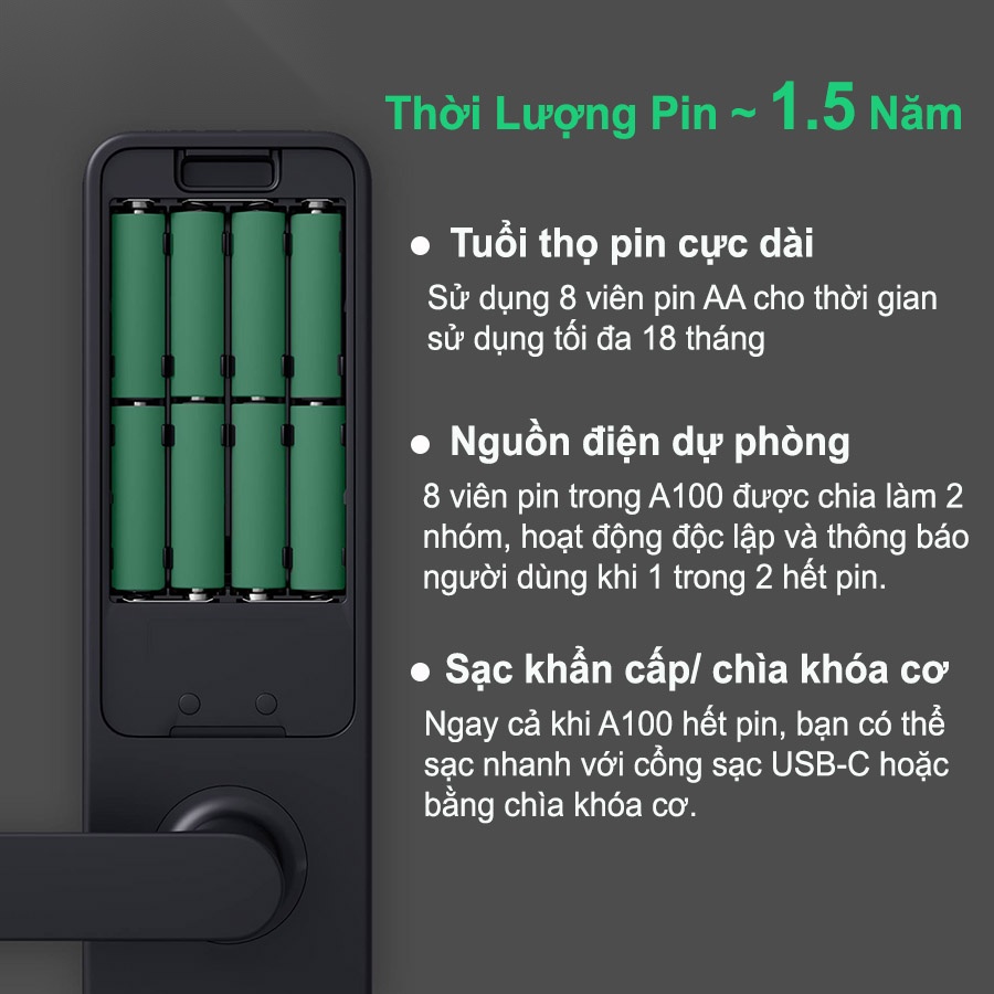 Với việc sử dụng tám pin AA, khóa cửa thông minh Aqara A100 Zigbee có tuổi thọ pin lên đến 18 tháng, bạn sẽ nhận được cảnh báo khi pin giảm dưới 20%. Khi pin hoàn toàn hết, người dùng vẫn có thể mở khóa bằng chìa khóa cơ hoặc sạc ổ khóa bằng pin dự phòng qua cổng Type-C.