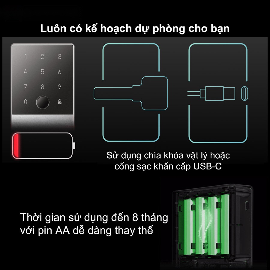 Đừng quá lo lắng khi bạn gặp phải những tình huống không mong muốn, bởi vì khóa Aqara U100 cung cấp nhiều phương thức khác nhau để mở và bạn có thể vào bên trong nhà, như là sử dụng chìa khóa vật lý hoặc cổng sạc khẩn cấp USB-C ở bảng điều khiển bên ngoài. Đặc biệt, khóa còn có cảnh báo pin yếu, đảm bảo bạn luôn nắm bắt được tình trạng pin của khóa và có phương án dự phòng để vào nhà an toàn.