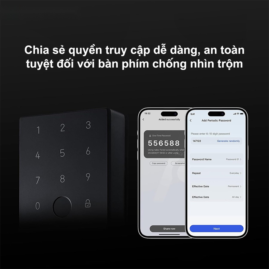 Khóa cửa thông minh Aqara U100 DL-D01D trang bị bàn phím chống nhìn trộm, cho phép bạn nhập các ký tự ngẫu nhiên trước hoặc sau mật mã để ngăn chặn ánh mắt tò mò. Bạn có thể lựa chọn các loại mật mã: vĩnh viễn, định kỳ hoặc một lần, phù hợp với mọi nhu cầu từ cấp quyền truy cập cho người thân, bạn bè, dịch vụ dọn phòng hoặc khách thuê phòng,…. Đặc biệt, mật mã một lần được tạo cục bộ, giúp đảm bảo ngôi nhà luôn an toàn ngay cả khi khóa không kết nối internet. Sự tiện lợi và bảo mật giờ đây luôn trong tầm tay bạn!
