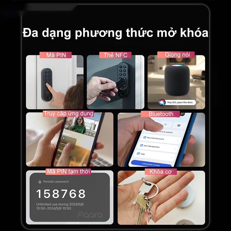 Khóa cửa thông minh Aqara U200 mang đến nhiều phương thức mở khóa đa dạng, bao gồm chìa khóa cơ, mã PIN cá nhân, vân tay và thẻ NFC, đáp ứng mọi nhu cầu sử dụng. Ngoài ra, tính năng điều khiển bằng giọng nói như “Hey Siri, open the door” hoặc mở khóa từ xa qua ứng dụng Aqara Home đảm bảo sự tiện lợi tối đa. Khóa còn hỗ trợ các hệ sinh thái bên thứ ba, tạo nên một trải nghiệm đồng bộ, toàn diện cho người dùng.