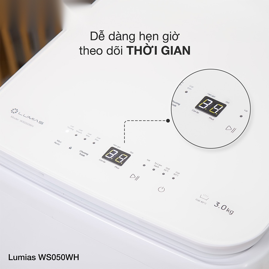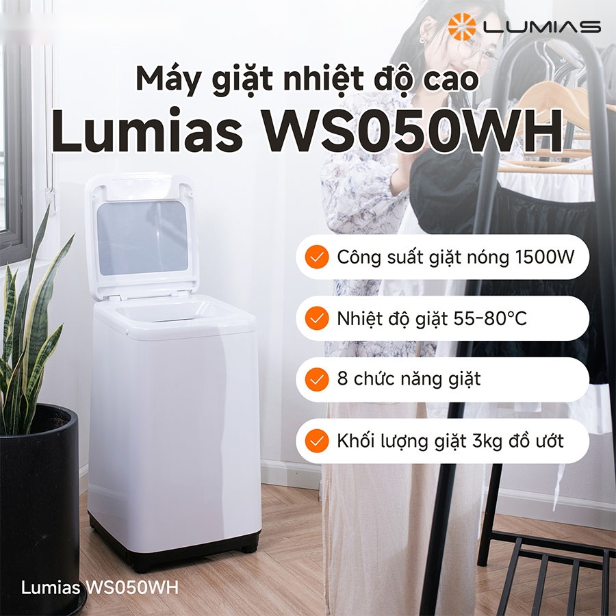 Công nghệ giặt nhiệt độ cao là điểm nhấn nổi bật của Lumias WS050WH, cho phép lựa chọn 55°C hoặc 80°C tùy chất liệu vải và mức độ bám bẩn. Giặt nóng giúp tiêu diệt vi khuẩn, mạt bụi và các yếu tố gây kích ứng, đặc biệt phù hợp với đồ em bé hay quần áo lót cần vệ sinh kỹ. Nhờ đó, quần áo sau khi giặt luôn mềm mại, sạch khuẩn và an toàn cho làn da nhạy cảm.