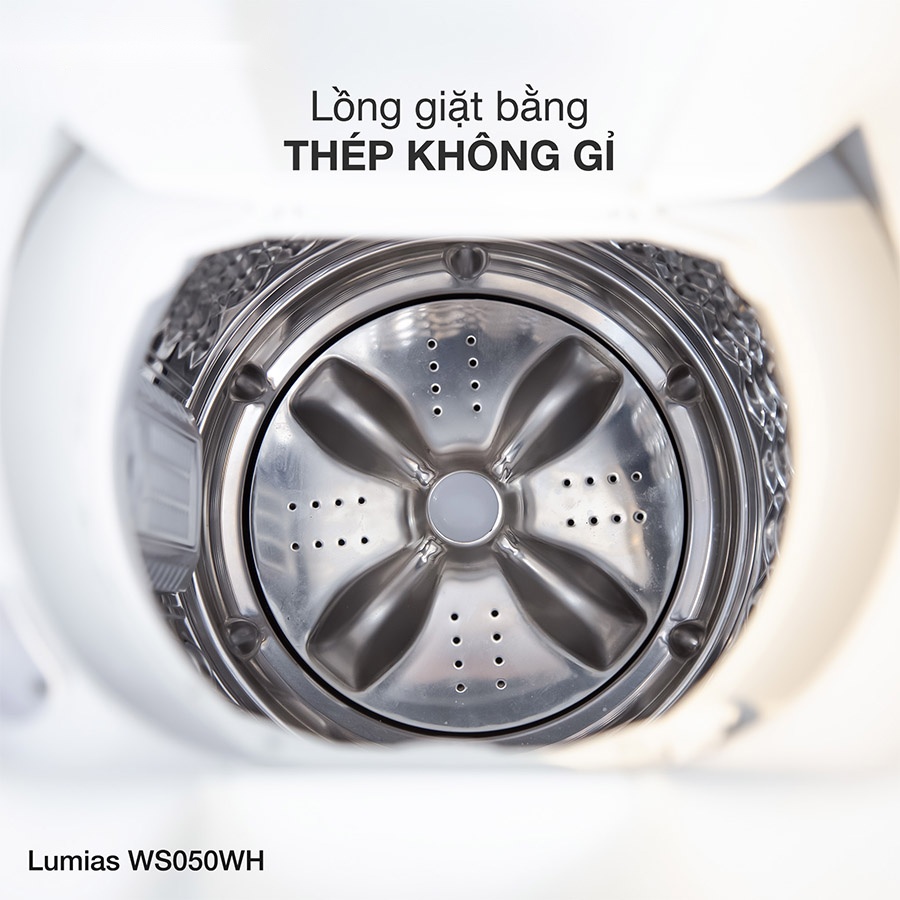 Lumias WS050WH thiết kế lồng giặt thép không gỉ hình lục giác giúp hạn chế xơ rối và giữ dáng quần áo tốt hơn khi quay ở tốc độ cao. Chất liệu inox bền chắc, chịu được nhiệt độ cao trong các chu trình giặt nóng mà không bị biến dạng hay ăn mòn. Cùng với đó, mâm giặt 4 lớp tạo lực xoáy mạnh và đều, tăng hiệu quả đánh bay vết bẩn, giữ quần áo luôn bền và sạch theo thời gian sử dụng lâu dài.