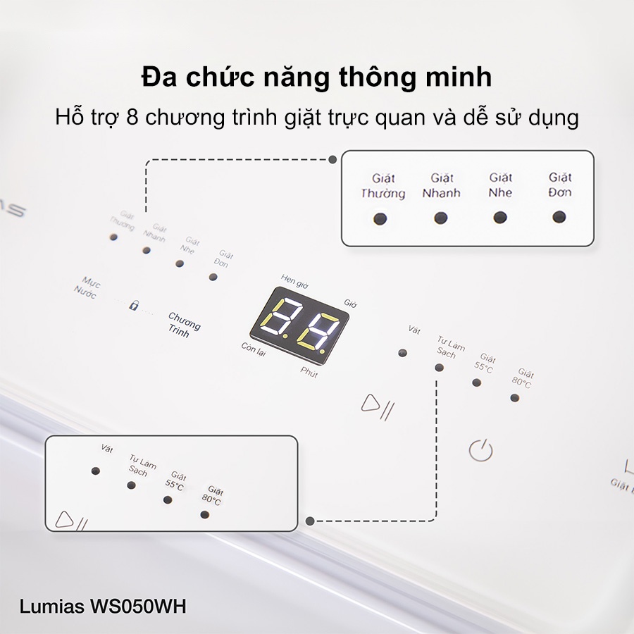 Lumias WS050WH hỗ trợ 8 chương trình giặt trực quan và dễ sử dụng, từ giặt nhanh, giặt nhẹ đến tự vệ sinh lồng giặt. Tính năng hẹn giờ lên đến 24h giúp bạn chủ động lịch sinh hoạt: cài đặt trước khi đi làm và quần áo sẽ sạch sẵn khi trở về. Màn hình hiển thị LCD lớn, rõ ràng cho phép theo dõi tình trạng máy, điều chỉnh mức nước và chế độ giặt chỉ bằng vài thao tác đơn giản.