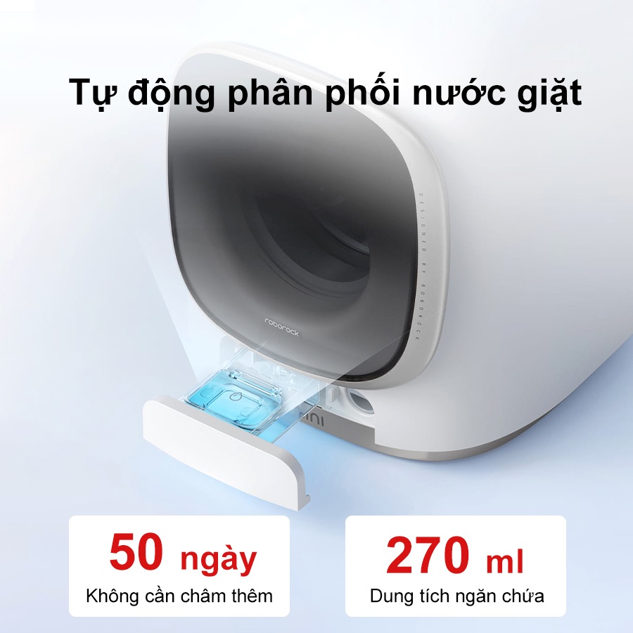 Với dung tích ngăn chứa nước giặt 270ml, bạn có thể sử dụng lên tới 50 ngày mà không cần châm thêm. Ngoài ra, bạn cũng có thể tùy chỉnh lượng nước giặt qua ứng dụng Roborock sao cho phù hợp với từng loại quần áo và nhu cầu cá nhân.
