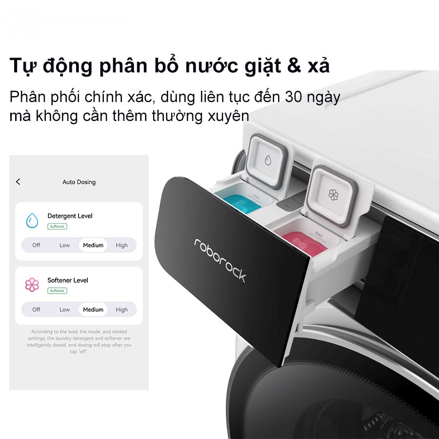 Tính năng Auto Dosing có trên máy giặt sấy Roborock Zeo One giúp bạn luôn đạt được hiệu quả giặt tối ưu trong mỗi lần sử dụng. Máy sẽ tự động tính toán lượng nước giặt và nước xả phù hợp dựa trên khối lượng quần áo. Bình chứa dung tích lớn lên đến 580ml nước giặt và 420ml nước xả, cho phép bạn sử dụng liên tục trong vòng 30 ngày mà không cần châm thêm nước. Ngoài ra, người dùng có thể tùy chỉnh liều lượng thông qua ứng dụng Roborock, phù hợp với nhu cầu cá nhân và loại vải đang giặt.