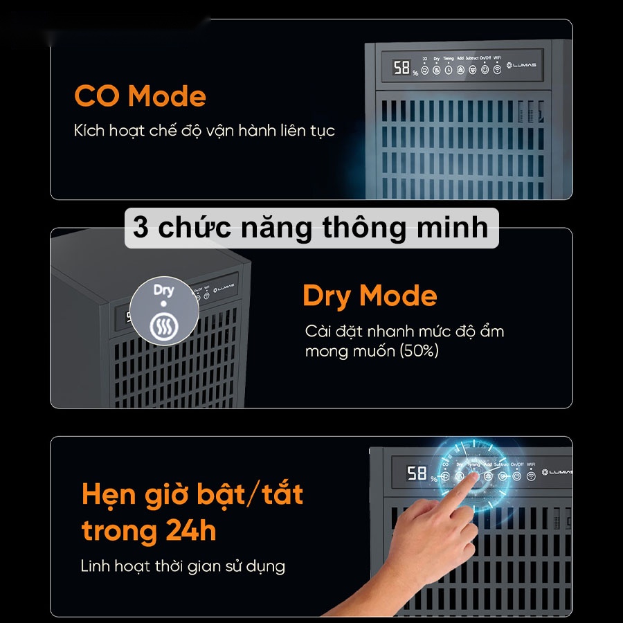 - 3 chế độ hoạt động thông minh: CO liên tục, Dry giữ 50%, hẹn giờ 24h