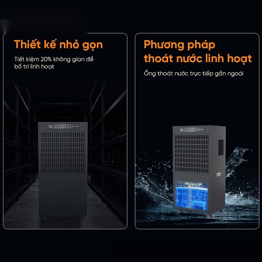 Sở hữu kích thước tối ưu, máy hút ẩm Lumias LID-S180 có thể bố trí linh hoạt trong nhiều không gian khác nhau, kể cả khu vực hạn chế diện tích. Máy được trang bị ống thoát nước trực tiếp, cho phép xả nước liên tục ra bên ngoài mà không cần dừng máy để đổ bình chứa, rất thuận tiện cho nhu cầu vận hành dài giờ trong môi trường công nghiệp.