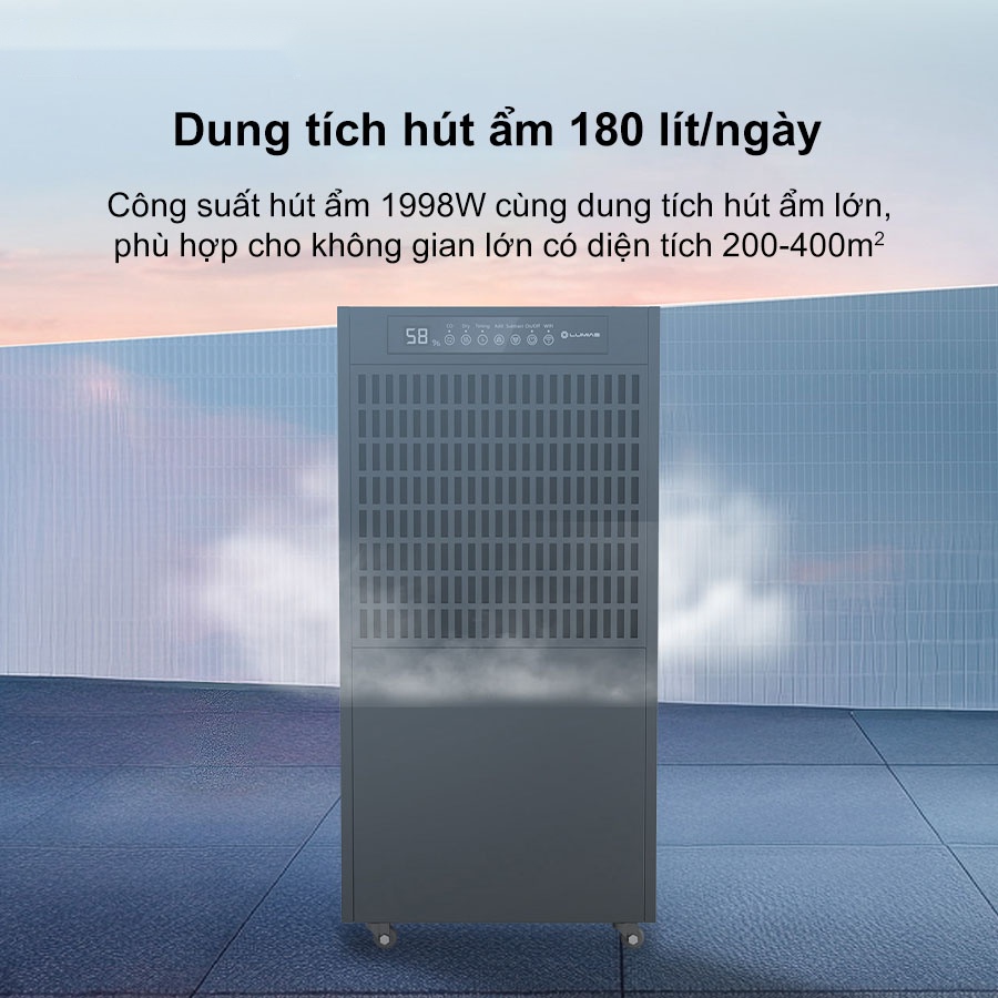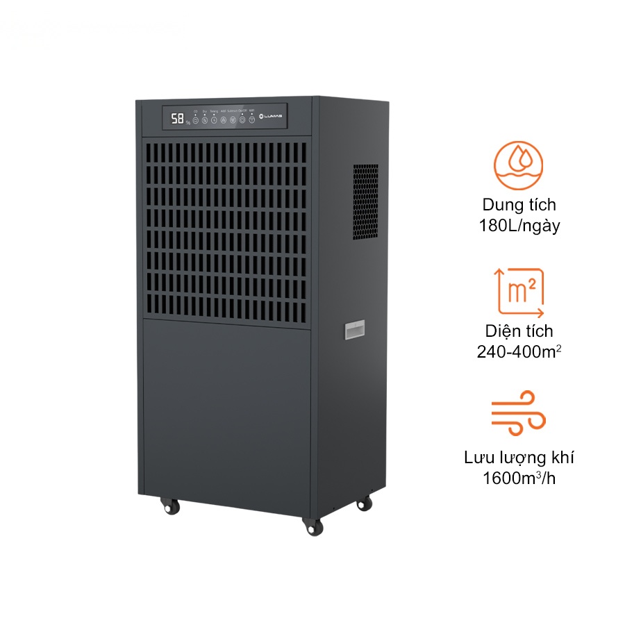 - Công suất hút ẩm lớn 180L/ngày, phù hợp không gian 250-400m²