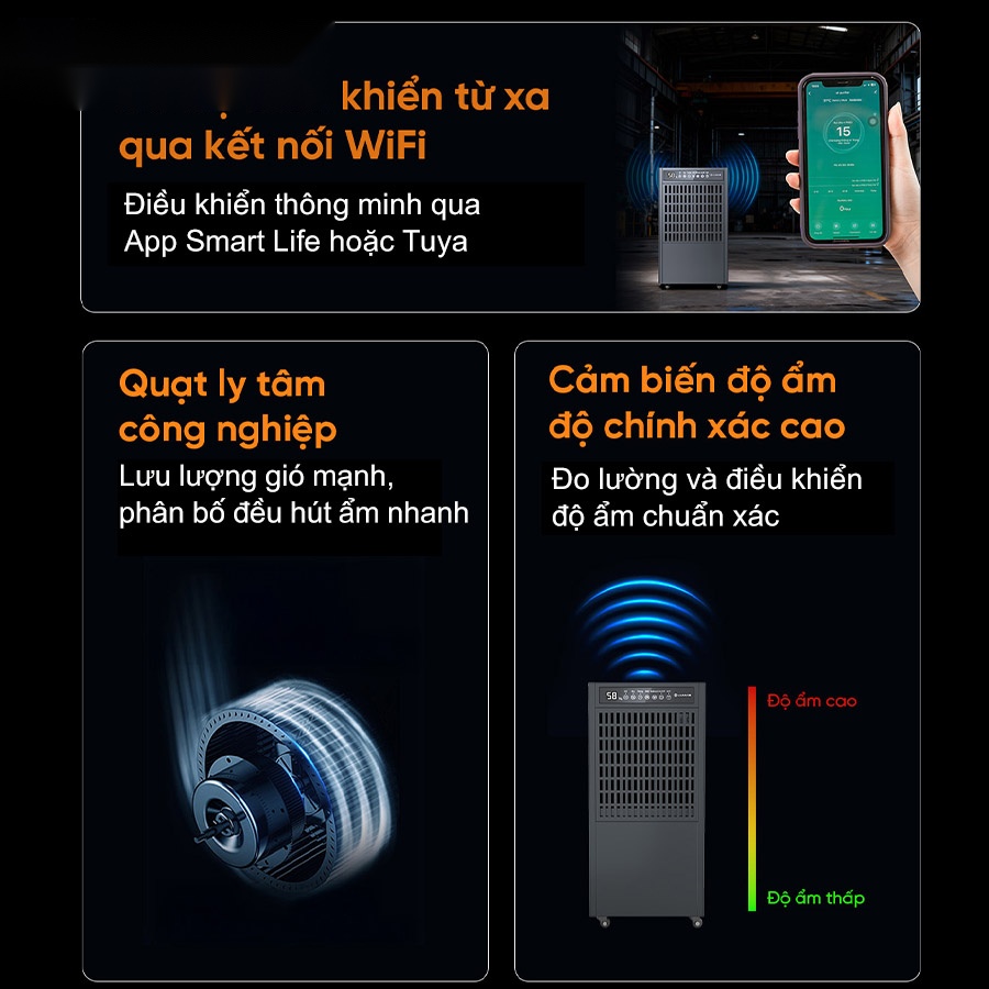 Máy hút ẩm công nghiệp Lumias LID-S180 sử dụng quạt ly tâm công nghiệp tạo luồng gió mạnh, phân bổ đồng đều khắp không gian rộng, hỗ trợ quá trình hút ẩm diễn ra nhanh hơn. Cảm biến độ ẩm có độ chính xác cao giúp đo lường và duy trì mức ẩm theo thiết lập. Ngoài ra, thiết bị còn hỗ trợ kết nối WiFi, cho phép điều khiển từ xa qua ứng dụng Smart Life hoặc Tuya, giúp người dùng dễ dàng theo dõi và tùy chỉnh chế độ vận hành mọi lúc.