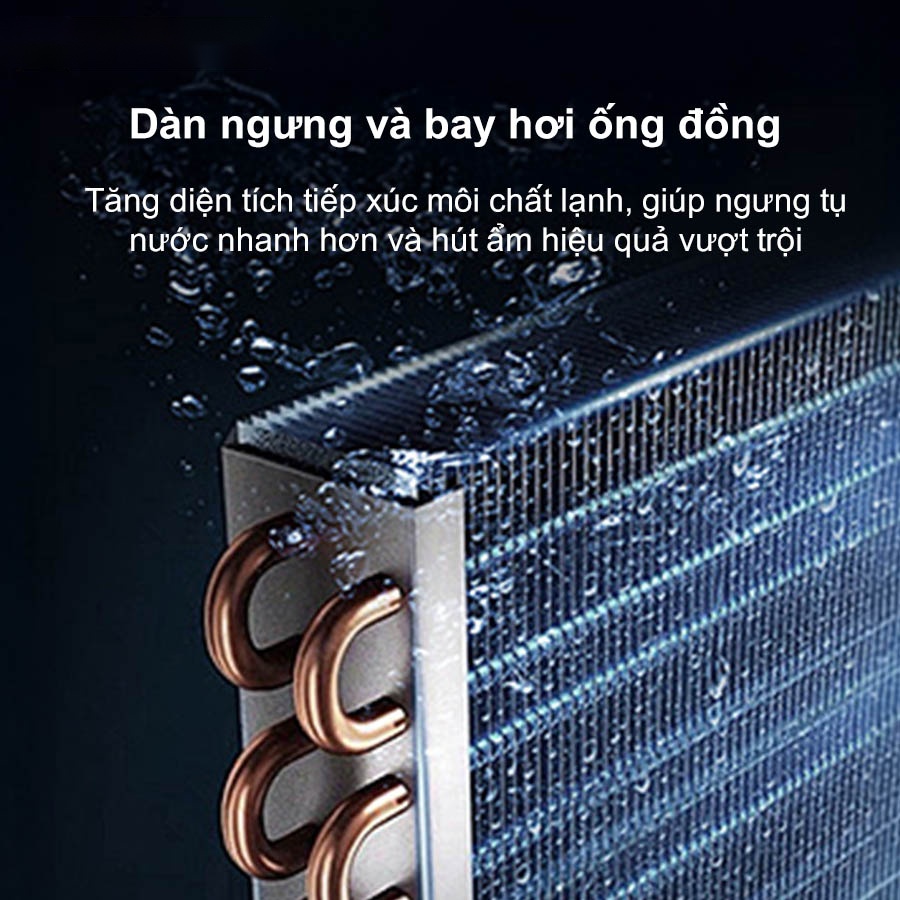 Máy hút ẩm Lumias LID-S180 ứng dụng dàn ngưng tụ và bay hơi bằng ống đồng nguyên chất, thiết kế rãnh xoắn trong giúp mở rộng diện tích tiếp xúc của môi chất lạnh. Cấu trúc này thúc đẩy quá trình trao đổi nhiệt diễn ra nhanh hơn, từ đó hơi ẩm được ngưng tụ thành nước liên tục. Nhờ khả năng ngưng tụ nước nhanh, thiết bị duy trì hiệu suất hút ẩm ổn định ngay cả trong môi trường có độ ẩm cao, đảm bảo không gian luôn khô ráo và hạn chế nấm mốc phát sinh.