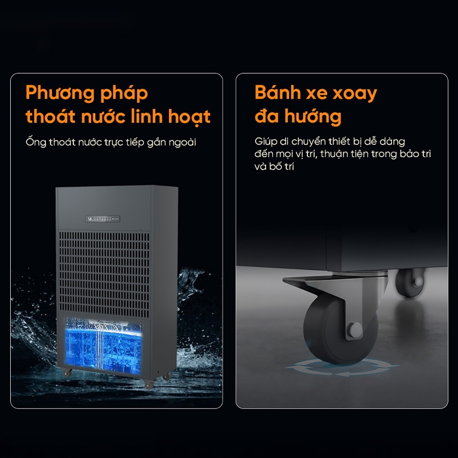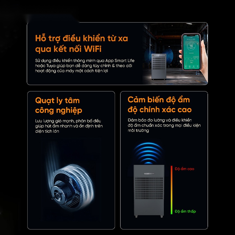 Công suất mạnh mẽ này giúp kiểm soát độ ẩm nhanh chóng tại các khu vực lớn như nhà xưởng, kho bảo quản hàng hóa, trung tâm dữ liệu, khu sản xuất thực phẩm – dược phẩm. Việc duy trì mức ẩm lý tưởng không chỉ ngăn chặn nấm mốc, hơi nước ngưng tụ mà còn bảo vệ chất lượng sản phẩm và máy móc, đảm bảo hoạt động sản xuất luôn ổn định và an toàn.