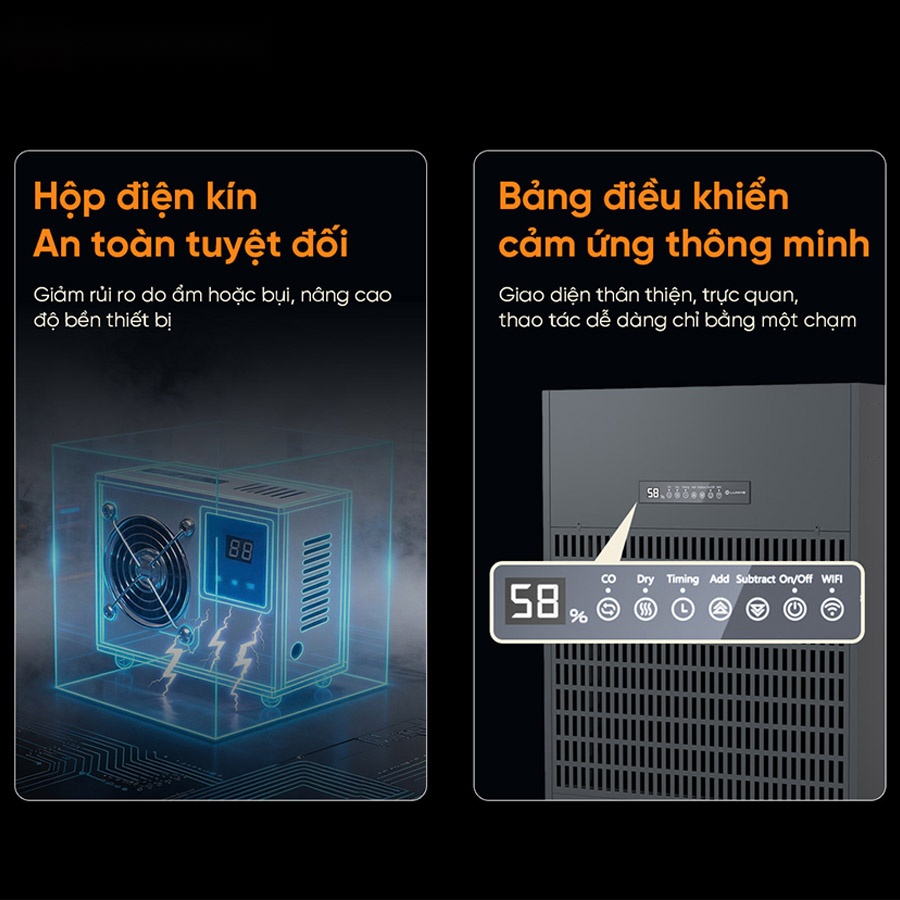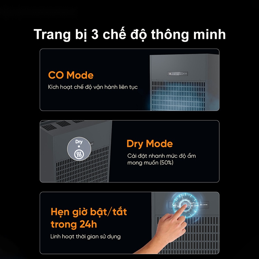 - Hỗ trợ 3 chế độ hoạt động chính: CO, Dry, Hẹn giờ 24h