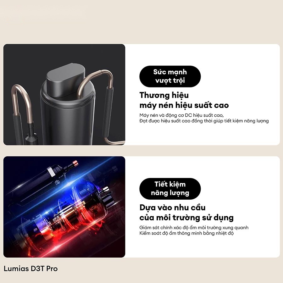 Máy hút ẩm Lumias D3T Pro với thiết kế ống dẫn khí và thoát khí độc đáo, nhanh chóng cân bằng độ ẩm trong phòng, mang đến bầu không khí trong lành và thoáng đãng. Thiết bị có hiệu suất hút ẩm cao hơn 30% so với các sản phẩm cùng loại, giúp bạn dễ dàng duy trì môi trường sống lý tưởng trong các không gian khác nhau như phòng khách, phòng ngủ, phòng tắm, và phòng trẻ em.