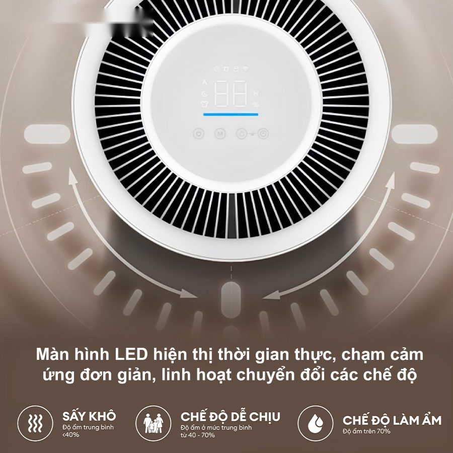 - Chế độ thông minh: Ở chế độ này, máy tự động điều chỉnh độ ẩm phù hợp, giúp duy trì không gian sống luôn thoải mái, dễ chịu mà không cần sự can thiệp thủ công từ người dùng.