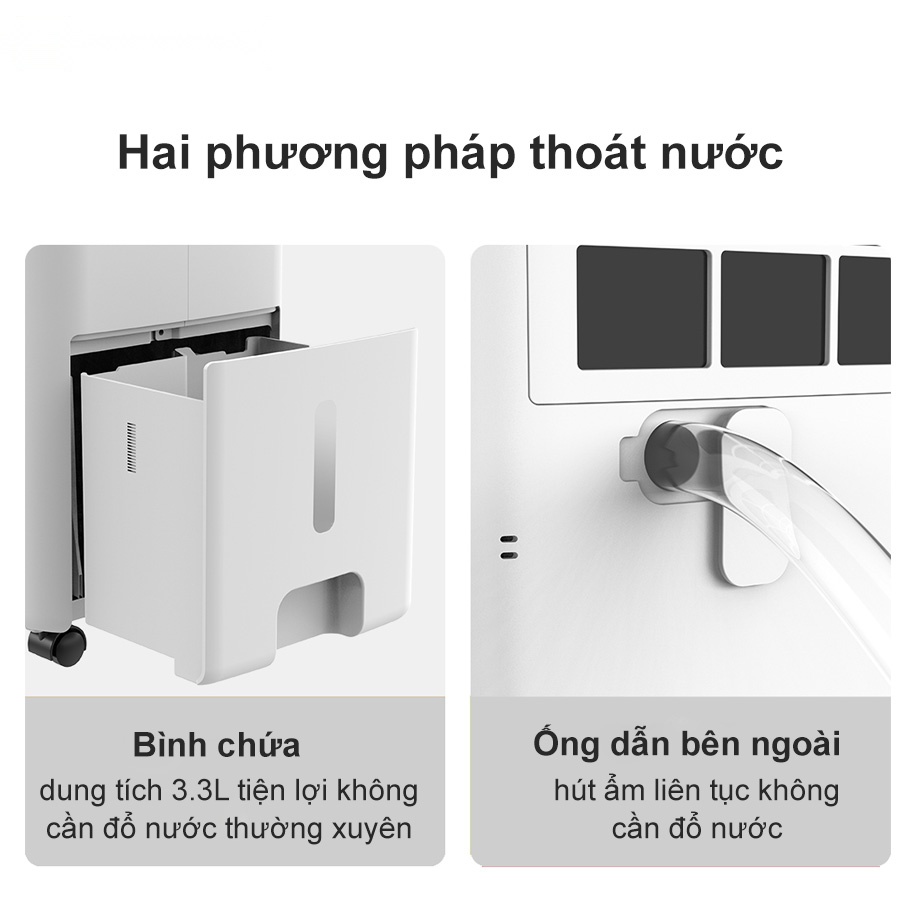 Có thể chọn một trong hai phương pháp thoát nước tùy theo nhu cầu đáp ứng nhu cầu của gia đình bạn. Phương pháp 1: dùng bình chứa với dung tích 3.3L khi đầy máy sẽ tự động dừng hút ẩm, bạn chỉ cần xách đổ nước có thể tận dụng tưới cây trong nhà. Phương pháp 2: dùng ống dẫn thoát nước trực tiếp ra bên ngoài mà không lo quên đổ bỏ nước, hút ẩm liên tục cho cả ngày đêm.