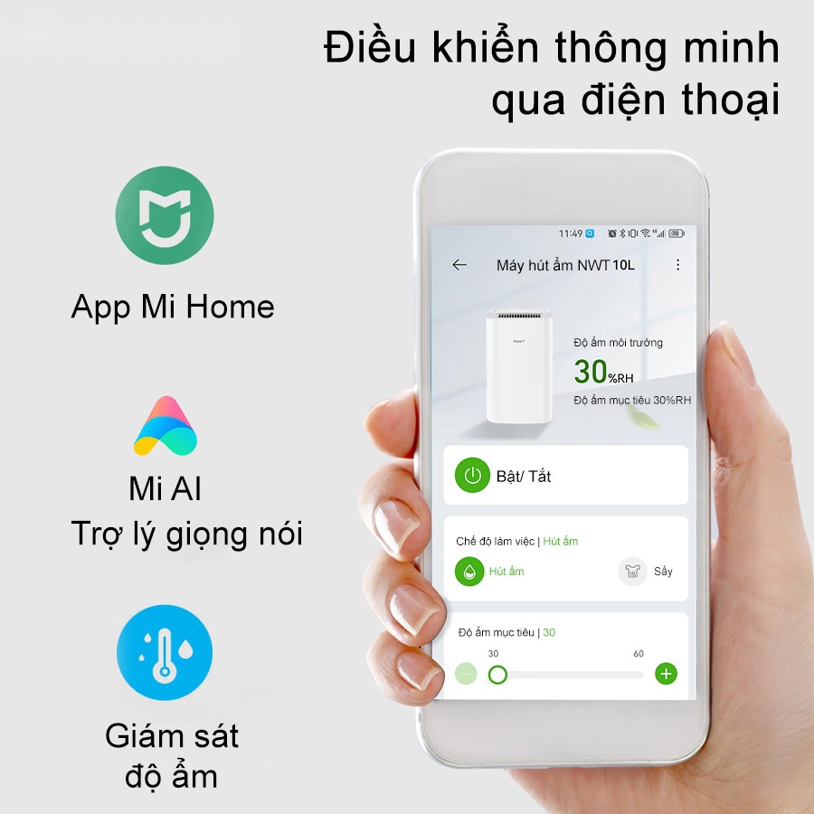 Với máy hút ẩm không khí thông minh NEW WIDETECH 10L, bạn có khả năng quản lý và điều khiển máy từ xa thông qua ứng dụng “Mi Home” trên chiếc smartphone của mình. Bằng cách kết nối và đồng bộ thông qua ứng dụng này, bạn có thể kiểm soát độ ẩm theo thời gian thực và tùy chỉnh chế độ độ ẩm phù hợp một cách dễ dàng. Ngoài ra, bạn cũng có thể tắt hoặc bật thiết bị qua ứng dụng một cách thuận tiện.
