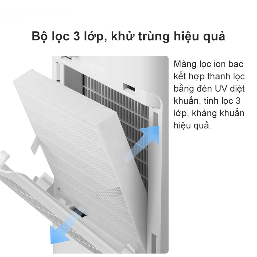 - Khử khuẩn hiệu quả với bộ lọc 3 lớp, màng lọc UVC giúp cải thiện chất lượng không khí