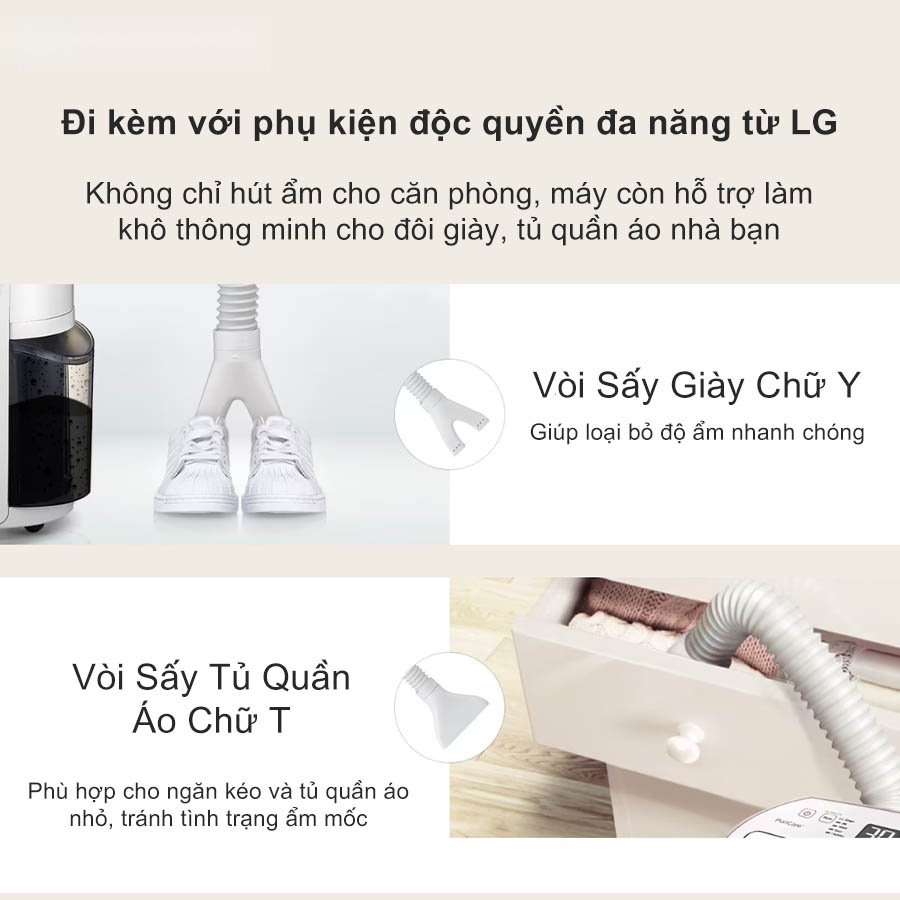 Máy hút ẩm LG Dual Inverter 16L không chỉ đơn thuần hút ẩm mà còn đi kèm bộ dụng cụ độc quyền của LG, mang đến khả năng hút khô giày với vòi chữ Y và làm khô quần áo nhanh chóng nhờ vòi chữ T. Điều này cực kỳ hữu ích trong những ngày mưa ẩm, khi quần áo khó khô và giày dép dễ bị ẩm mốc. Chọn máy hút ẩm LG, bạn không chỉ bảo vệ sức khỏe mà còn tiết kiệm thời gian chăm sóc đồ dùng cá nhân.