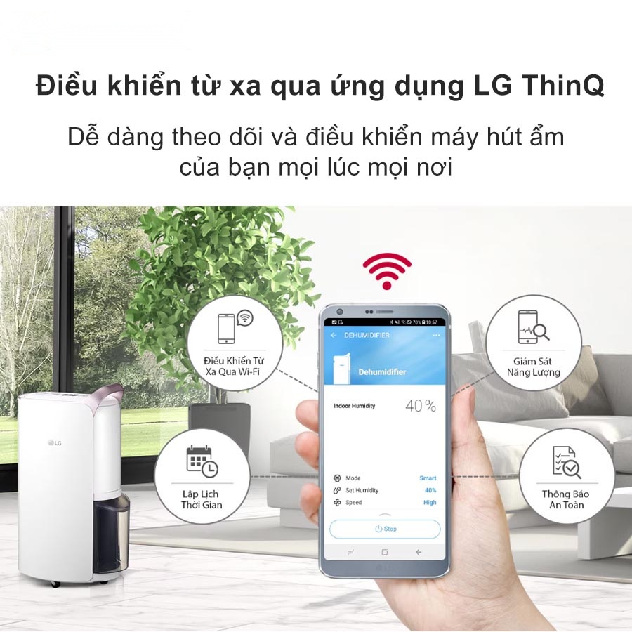 Máy hút ẩm LG Dual Inverter 16L không chỉ mang đến khả năng vận hành mạnh mẽ mà còn đi kèm với sự tiện lợi khi kết nối với ứng dụng LG ThinQ™. Thông qua ứng dụng này, người dùng có thể dễ dàng theo dõi và điều khiển thiết bị từ xa, ngay cả khi không ở nhà. Một loạt các tính năng tiện ích bao gồm: