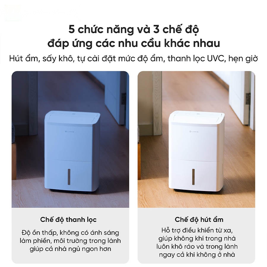 - Trang bị 5 chức năng và 3 chế độ hút ẩm