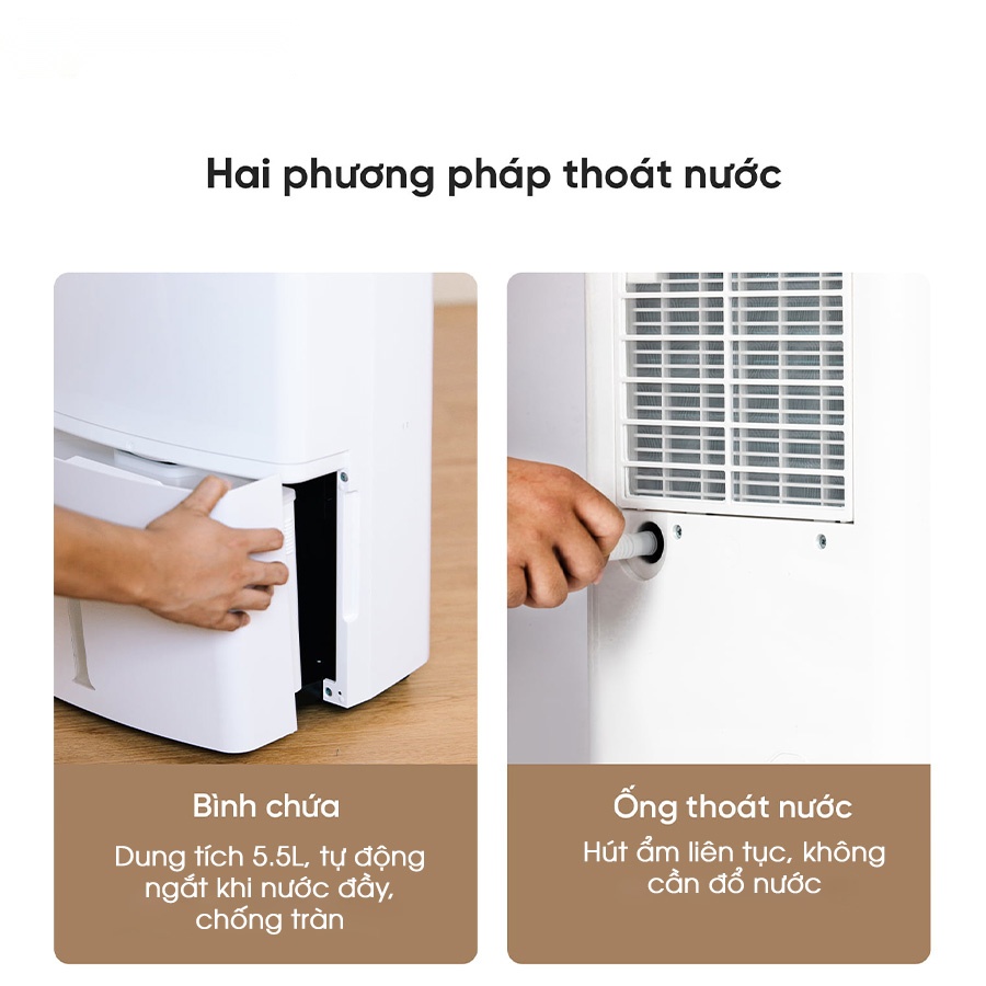 - Tích hợp bình chứa nước 5.5L và ống thoát nước tiện dụng