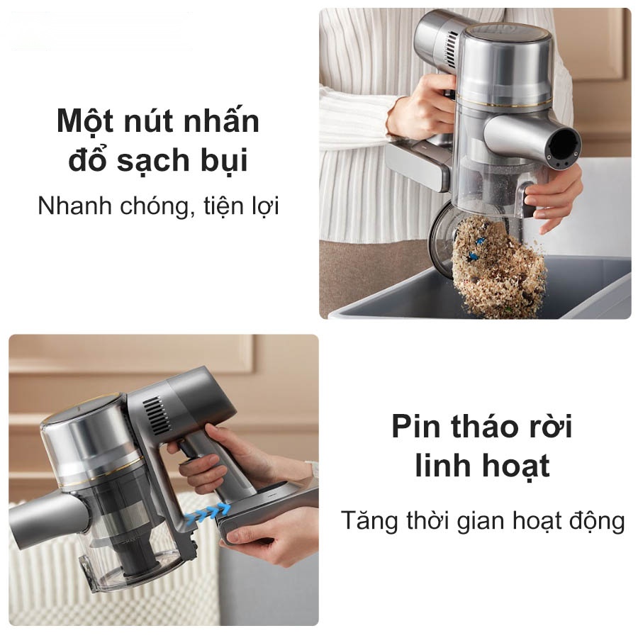 - Đổ bụi nhanh chóng: Chỉ cần một nút nhấn để đổ sạch bụi, giữ tay bạn không tiếp xúc trực tiếp với chất bẩn.
