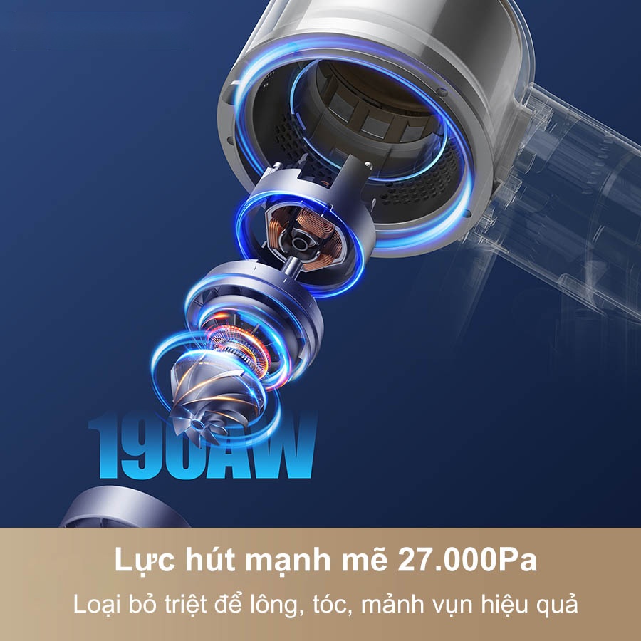 - Sức Hút 27.000Pa: Công suất hút 190 AW đảm bảo loại bỏ mọi loại rác, từ tóc rối, lông thú, đến các mảnh vụn lớn, hiệu quả hơn hẳn các dòng máy thông thường, giúp tiết kiệm thời gian dọn dẹp.