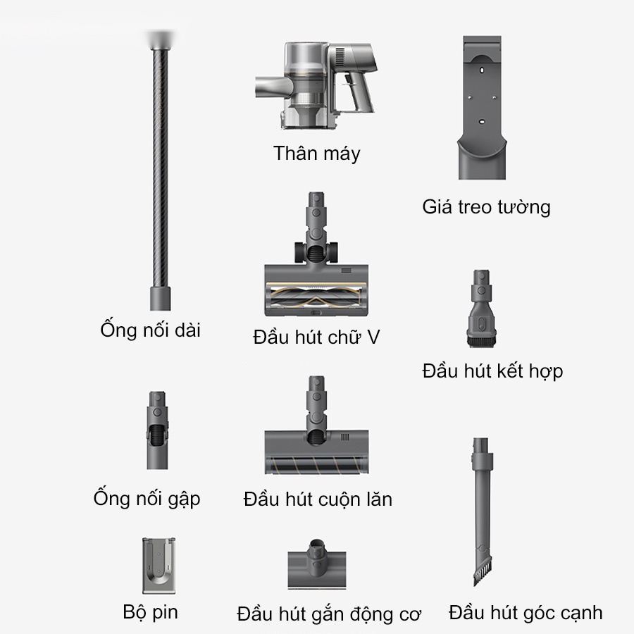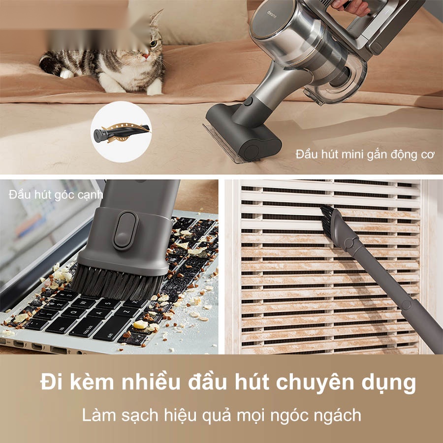 - Nhiều đầu hút chuyên dụng làm sạch hiệu quả mọi bề mặt: sàn gỗ, thảm, sofa, rèm cửa, góc tủ…