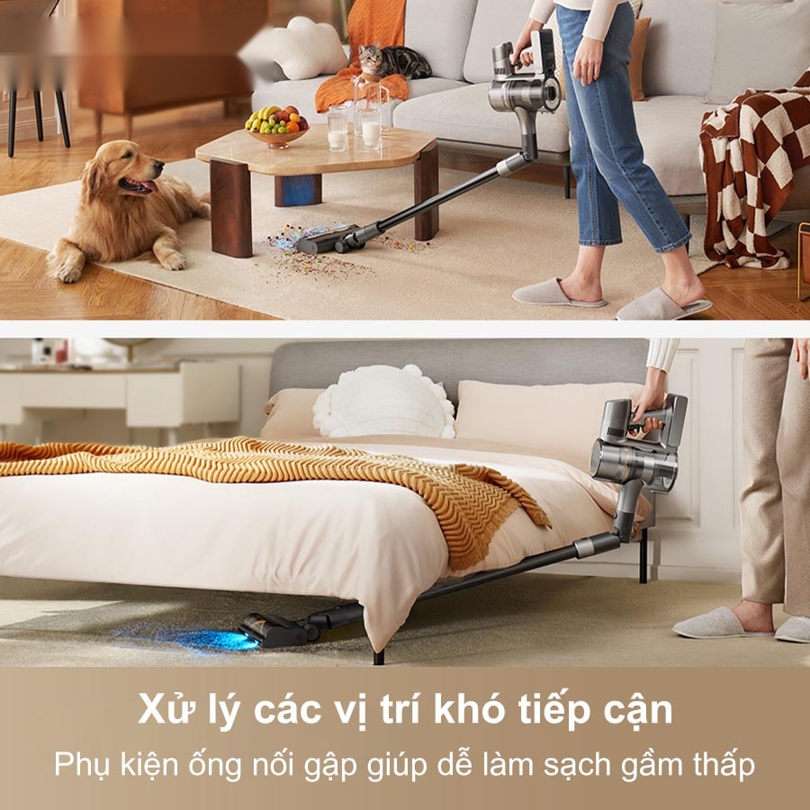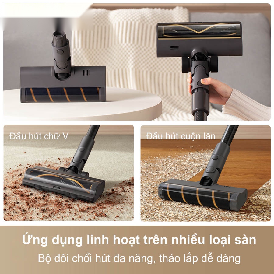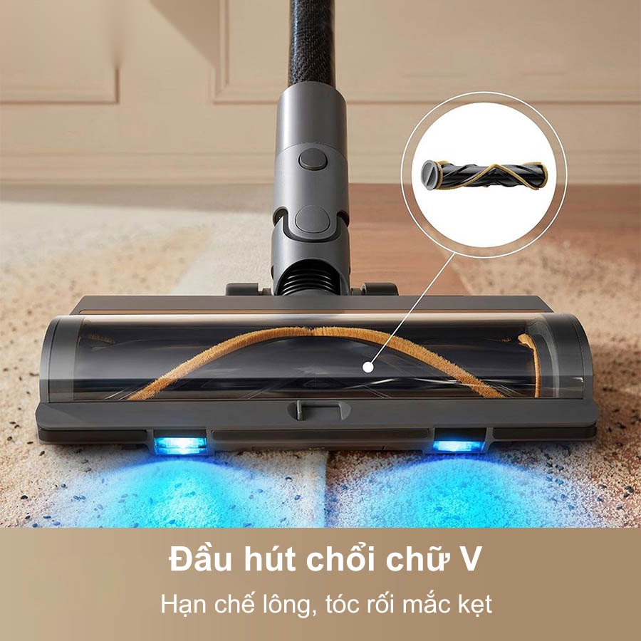 - Đầu Hút Chổi Chữ V (Đa năng): Thiết kế đặc biệt này giúp hạn chế tối đa lông và tóc rối mắc kẹt vào cuộn chổi, một vấn đề lớn ở hầu hết các dòng máy hút bụi khác. Đầu hút này ứng dụng linh hoạt trên cả sàn cứng và thảm.