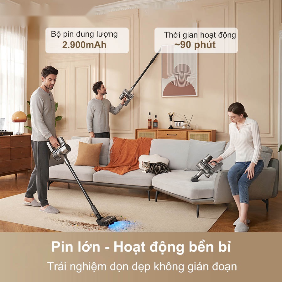 Với bộ pin dung lượng 2.900mAh, Dreame R20 có thể hoạt động liên tục lên đến 90 phút. Điều này cho phép bạn hoàn tất việc dọn dẹp toàn bộ căn nhà mà không bị gián đoạn. Đặc biệt, pin có thể tháo rời linh hoạt giúp người dùng dễ dàng sạc pin tiện lợi hơn và có thể tăng gấp đôi thời gian hoạt động nếu sở hữu pin dự phòng.