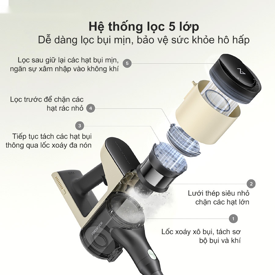 Hệ thống lọc của Roborock H5 được thiết kế thành năm giai đoạn riêng biệt, mỗi giai đoạn đều đóng vai trò quan trọng trong việc giữ lại bụi và các hạt có hại:
