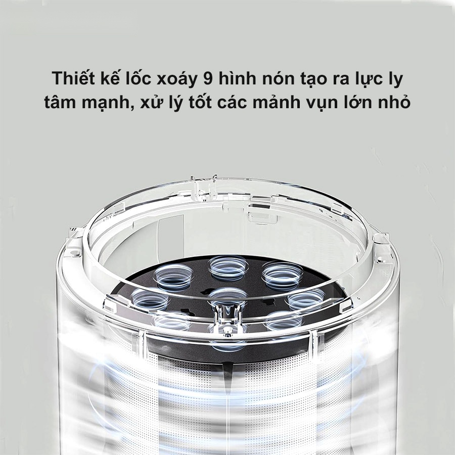 - Lọc lốc xoáy đa nón: Các hạt bụi nhỏ hơn tiếp tục bị tách ra bởi hệ thống lốc xoáy chín hình nón, giúp nâng cao hiệu quả lọc và duy trì sức hút mạnh mẽ của máy.