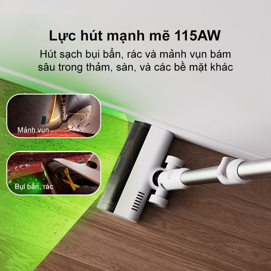 Máy hút bụi cầm tay Roborock H60 được trang bị lực hút mạnh mẽ lên đến 115AW, cho phép xử lý hiệu quả từ bụi mịn đến những mảnh vụn cứng đầu. Dù là thảm lông dày hay bề mặt sàn gạch, thiết bị vẫn đảm bảo khả năng làm sạch sâu, mang lại không gian trong lành và sáng bóng.
