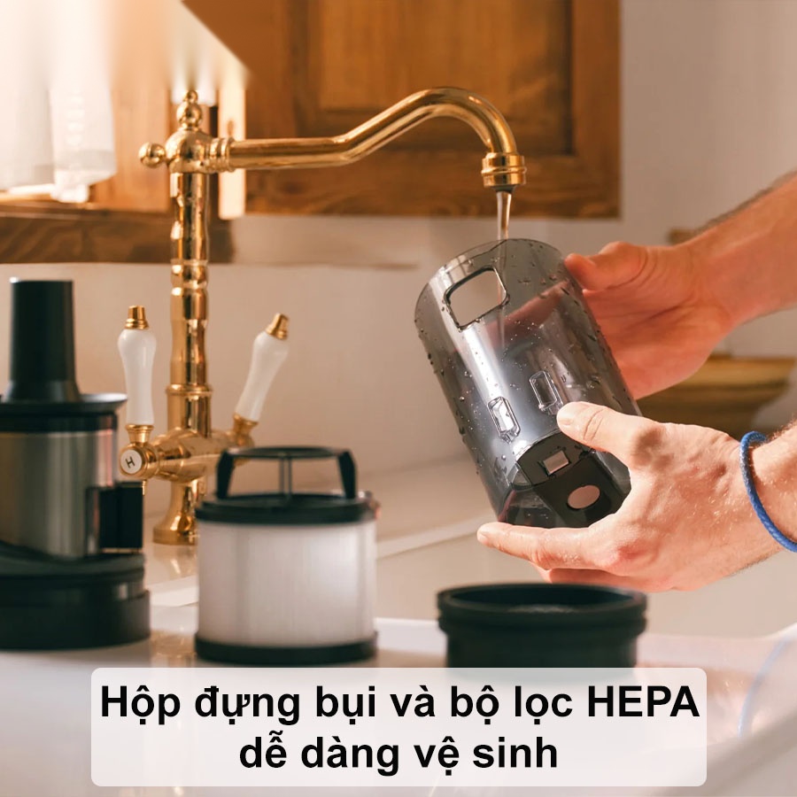 Hộp bụi và bộ lọc HEPA dễ dàng làm sạch với nước, giúp duy trì hiệu quả lọc lâu dài và giữ cho thiết bị luôn sạch sẽ, sẵn sàng vận hành tối ưu trong mọi lần sử dụng.