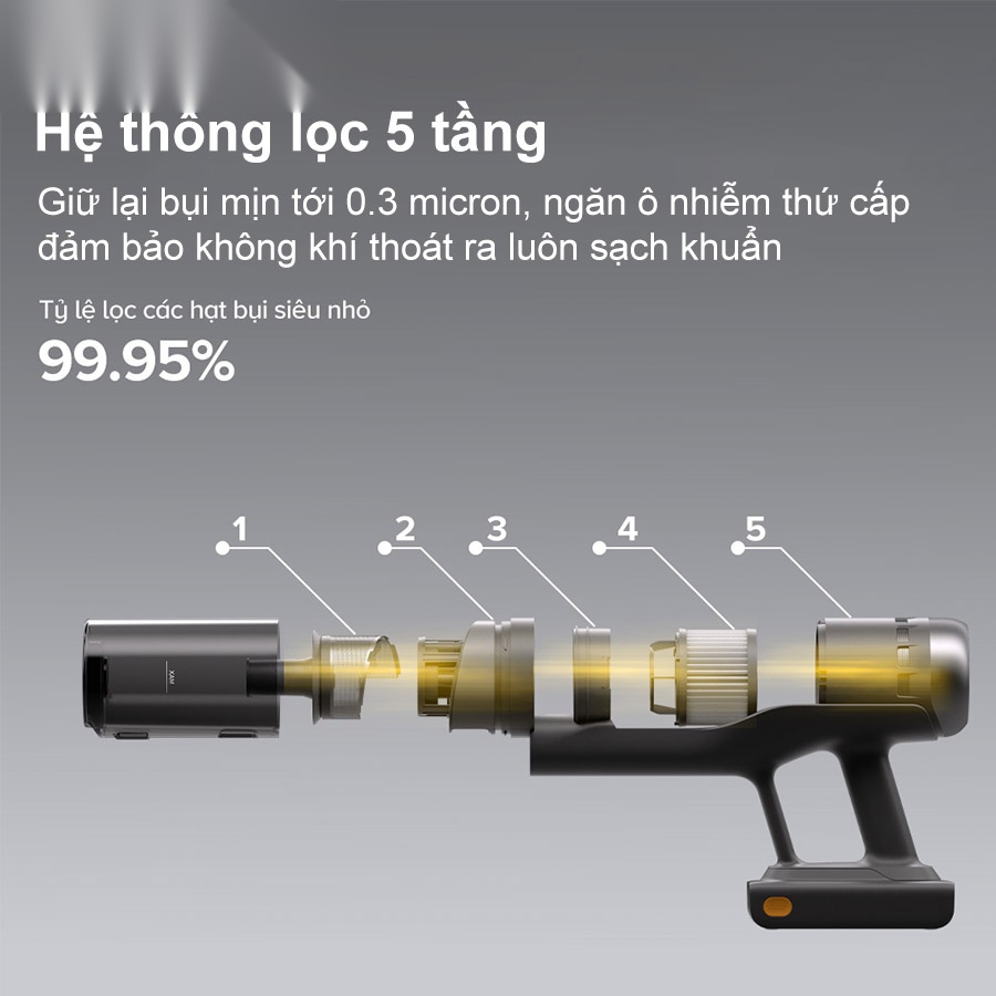 Không chỉ dừng lại ở việc làm sạch sàn nhà, Roborock H60 Ultra còn quan tâm đến chất lượng không khí trong không gian sống của bạn. Thiết bị được trang bị hệ thống lọc 5 lớp hiện đại, cho khả năng giữ lại tới 99,95% bụi mịn có kích thước nhỏ đến 0,3 micron, giúp ngăn chặn hiệu quả vi khuẩn, phấn hoa và các chất gây dị ứng. Cấu trúc lọc bao gồm: