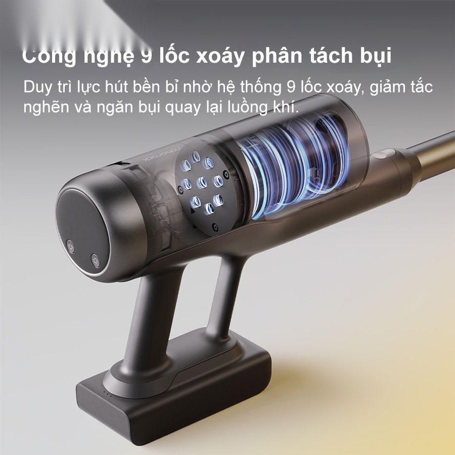 Máy hút bụi cầm tay Roborock H60 Ultra được tích hợp công nghệ 9 lốc xoáy giúp phân tách bụi hiệu quả, giảm thiểu tình trạng tắc nghẽn bộ lọc trong quá trình vận hành. Hệ thống này liên tục đẩy bụi và rác ra khỏi luồng khí, duy trì lực hút ổn định và mạnh mẽ trong suốt quá trình sử dụng. Nhờ đó, người dùng không còn phải lo lắng về việc lực hút giảm dần sau thời gian dài sử dụng như ở các dòng máy thông thường.