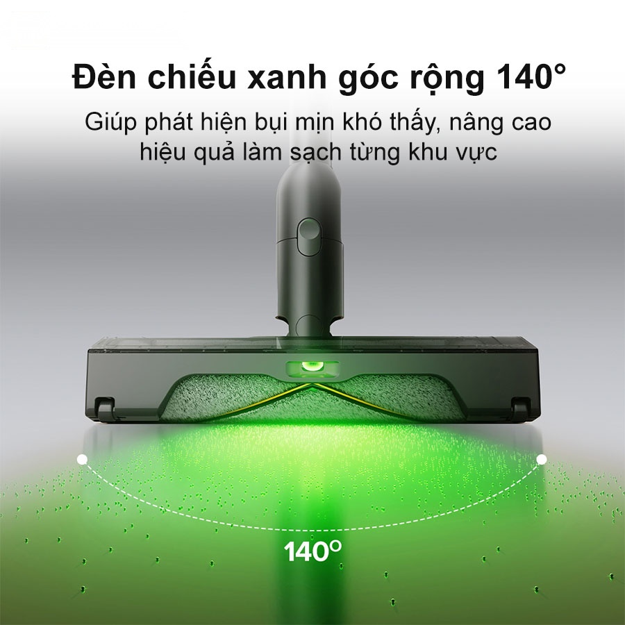 Một điểm nổi bật không thể bỏ qua của Roborock H60 Ultra chính là đèn chiếu xanh góc rộng 140°. Công nghệ này giúp làm lộ rõ những hạt bụi mịn và mảng bẩn khó nhìn thấy bằng mắt thường, nhờ đó người dùng có thể phát hiện và xử lý triệt để các khu vực chưa sạch. Kết hợp cùng với lực hút mạnh, tính năng này góp phần nâng tầm trải nghiệm làm sạch lên một chuẩn mực mới.
