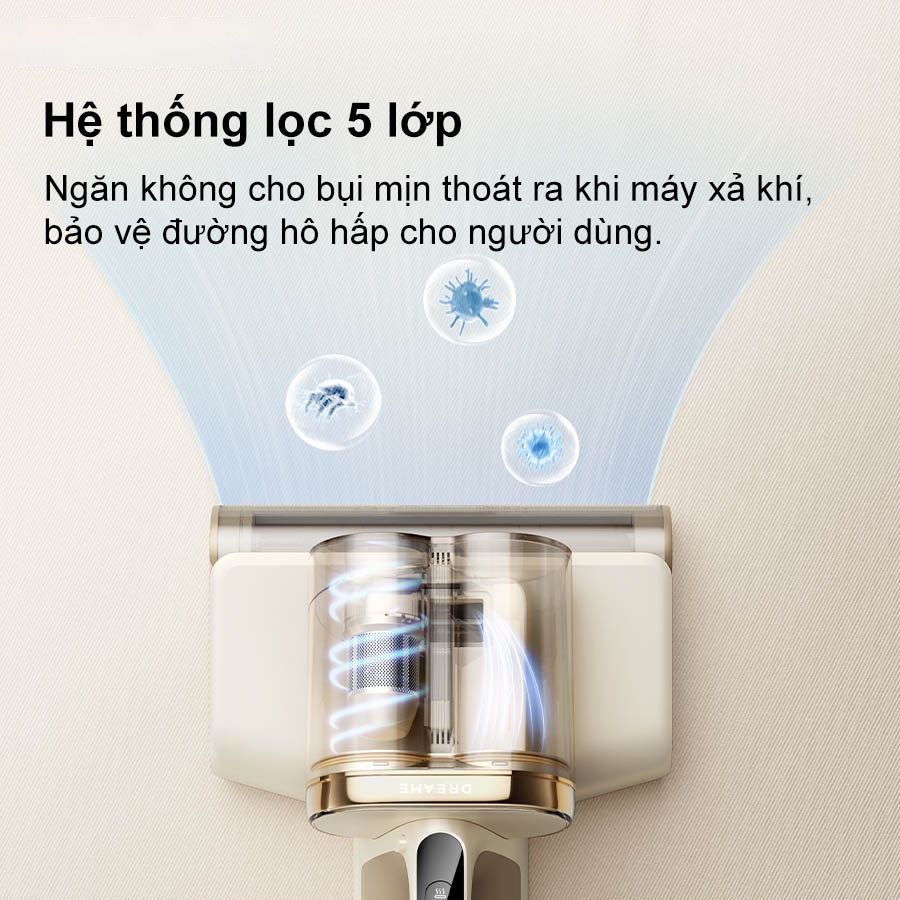 Hệ thống lọc 5 lớp của máy hút bụi giường nệm Dreame D20 Pro bao gồm tách lốc xoáy, màng lưới, lớp bọt, bộ lọc HEPA và màng bảo vệ cuối, giữ lại hầu hết các hạt siêu mịn và phấn hoa. Cấu trúc này ngăn không cho bụi mịn thoát ra khi máy xả khí, bảo vệ đường hô hấp cho người dùng. Việc lọc sâu không chỉ làm sạch bề mặt mà còn cải thiện chất lượng không khí trong phòng ngủ. Hệ thống lọc dễ tháo rời, thuận tiện cho việc vệ sinh định kỳ.