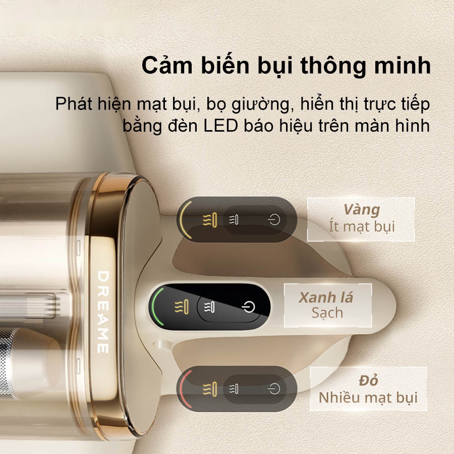 Cảm biến bụi thông minh của máy hút bụi giường nệm Dreame D20 Pro đánh giá mật độ bụi ngay khi đầu hút chạm bề mặt và báo hiệu bằng đèn đỏ, vàng hoặc xanh. Khi cảm biến nhận diện vùng bẩn cao, máy tự điều chỉnh lực hút và tần số rung để xử lý triệt để. Đèn báo trực quan giúp người dùng biết chính xác khi nào cần lặp lại thao tác hoặc chuyển vùng làm sạch. Tính năng này tối ưu hóa quy trình và đảm bảo kết quả nhanh chóng, có thể kiểm chứng bằng mắt.