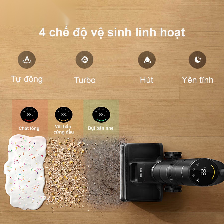 Máy hút bụi lau nhà khô và ướt Dreame H13 FlexReach hỗ trợ 4 chế độ: Tự động, Turbo, Hút và Yên tĩnh. Người dùng có thể tùy chỉnh linh hoạt theo từng nhu cầu dọn dẹp, từ hút bụi nhẹ nhàng hàng ngày đến xử lý các vết bẩn cứng đầu, tất cả đều dễ dàng được sử lí với các chế độ của Dreame H13 FlexReach