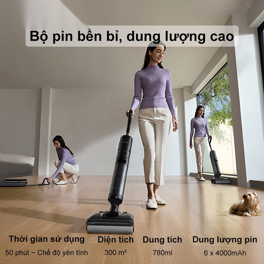 Sở hữu hệ thống pin 6 cell dung lượng 4.000mAh, máy hút bụi lau nhà khô và ướt Dreame H13 FlexReach hoạt động tối đa 50 phút ở chế độ Yên tĩnh, đủ để vệ sinh toàn bộ căn nhà hoặc văn phòng mà không bị gián đoạn.