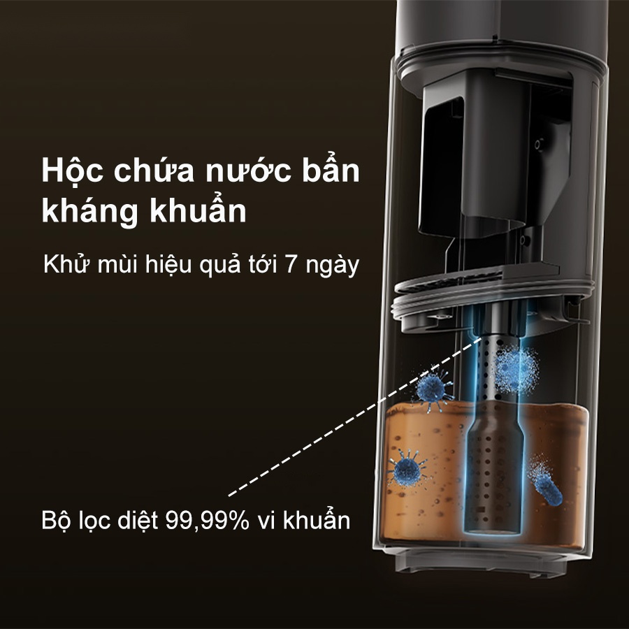 Máy hút bụi lau nhà khô và ướt Dreame H13 FlexReach trang bị hộc chứa nước bẩn có tính năng kháng khuẩn và khử mùi tiên tiến. Bộ lọc diệt 99,99% vi khuẩn, kết hợp chất khử mùi trung hòa hôi khó chịu, duy trì hiệu quả tới 7 ngày mà không cần vệ sinh ngay lập tức.