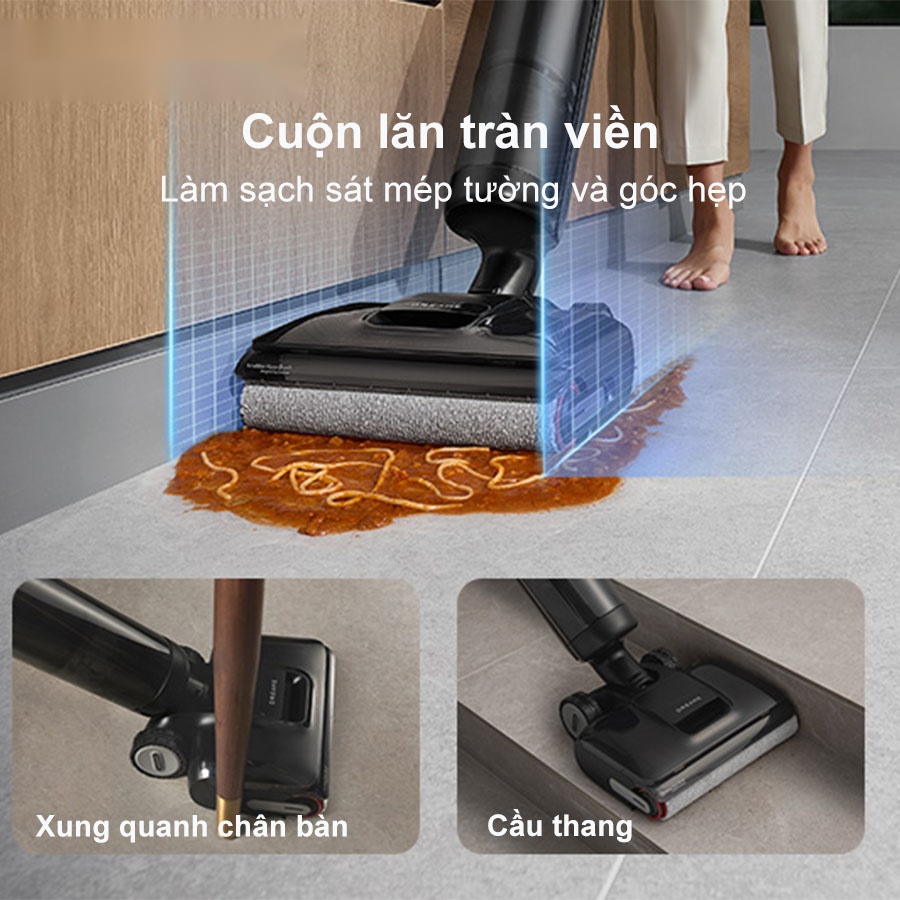 - Cuộn lăn tràn viền làm sạch hiệu quả sát mép tường và góc hẹp