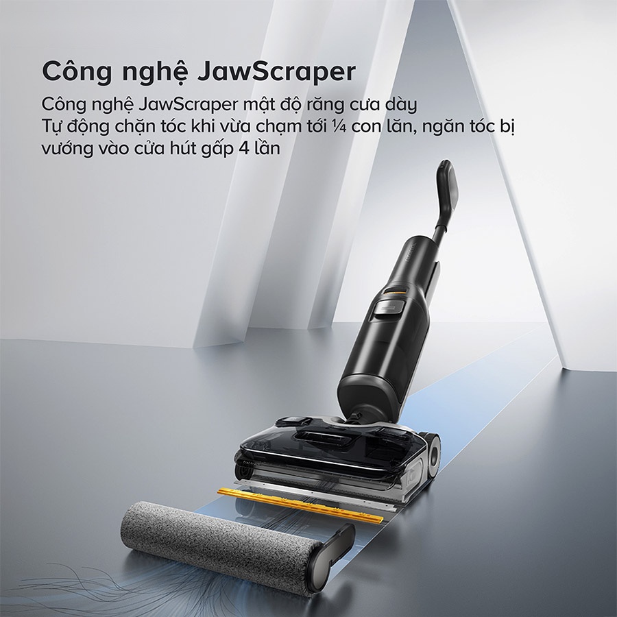 Máy hút bụi lau nhà cầm tay Roborock F25 ACE sử dụng hệ thống chống rối tóc độc quyền JawScraper, đảm bảo không còn tóc rối trong quá trình làm sạch. Hệ thống JawScraper này hoạt động dựa trên nguyên lý chải kép với 141 răng chải nhỏ, giúp chặn và loại bỏ mọi loại tóc bám vào con lăn của máy.