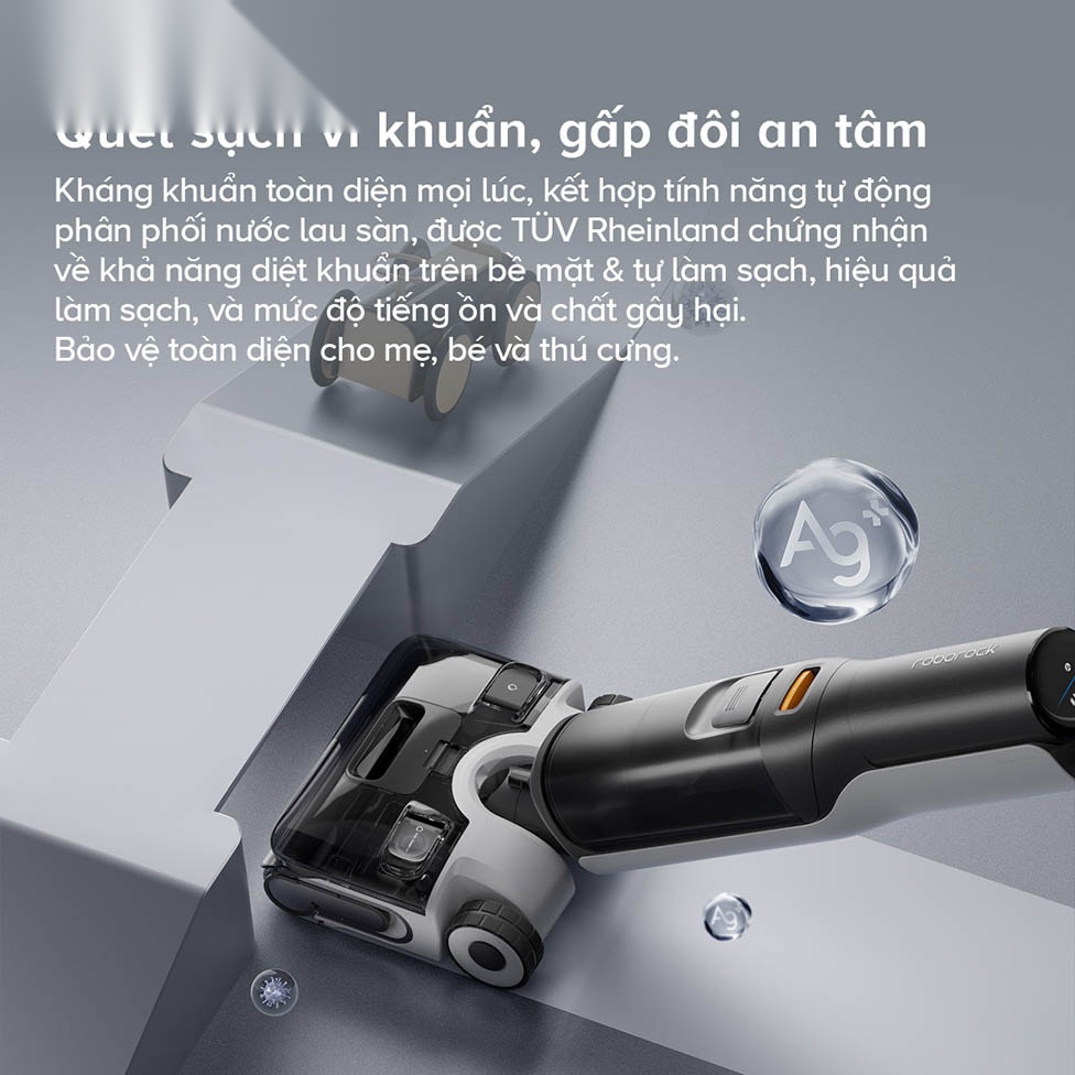 Hơn nữa, Roborock F25 ACE còn trang bị hệ thống kháng khuẩn toàn diện với công nghệ ion bạc trong bình nước, bộ lọc và chổi lăn, giúp ngăn chặn vi khuẩn phát triển trên mọi bề mặt. Hệ thống này đảm bảo khả năng kháng khuẩn 24/7, giữ cho không gian sống luôn sạch sẽ và an toàn.